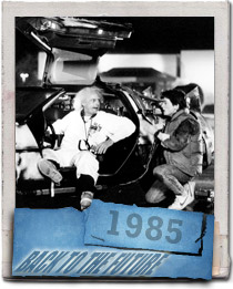 Inventor Doc Brown (Christopher Lloyd) explains the workings of his DeLorean time machine to a fascinated Marty McFly (Michael J. Fox).