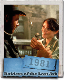 Indiana Jones (Harrison Ford) and Marion Ravenwood (Karen Allen) in Raiders of the Lost Ark. With the return of Marion in the new film, can we expect more drinking game fun to happen?