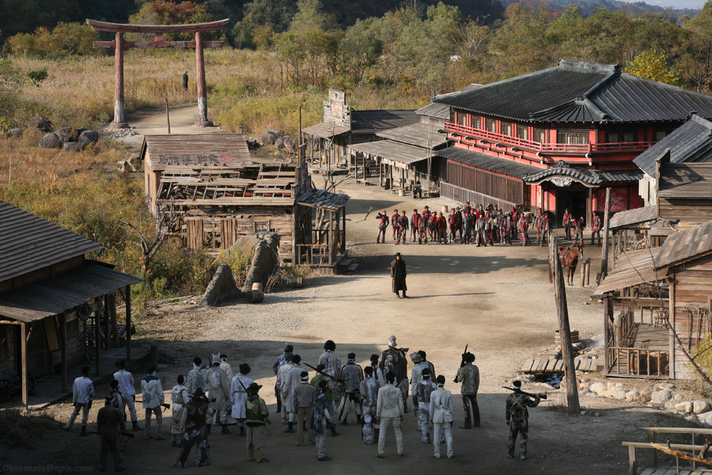 Sukiyaki Western Django was filmed on a specially built outdoor set in Ishikura, Yamagata, deep in the mountains of Tsukiyama. A surreal set combining both a western theme and “Jidai-geki” (Japanese period dramas) suddenly emerged in the midst of Tsukiyama’s magnificent mountain scenery.